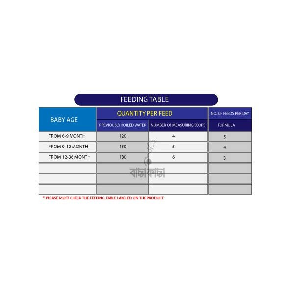 • Preparation: Consult the feeding table (See Pictures), add the exact number of leveled scoops for the age of the baby.